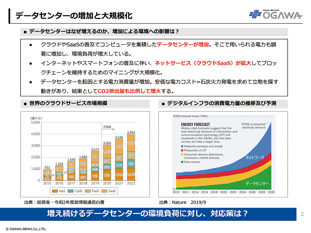 - クラウドやSaaSの普及でコンピュータを集積したデータセンターが増加。そこで用いられる電力も顕著に増加し、環境負荷が増大している。