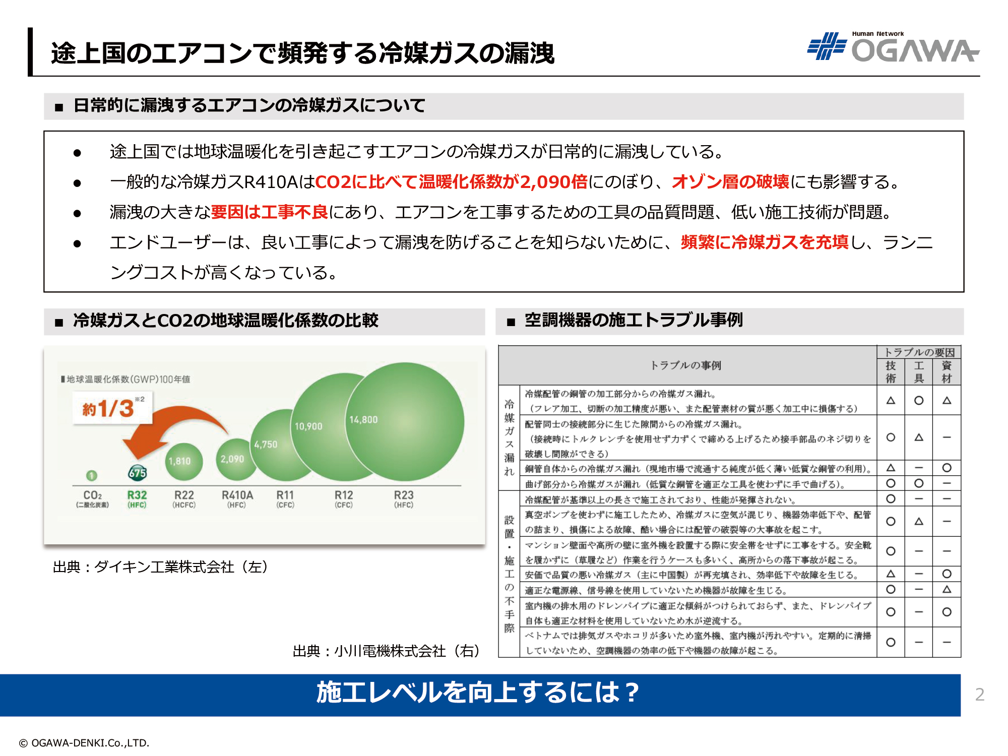 - 漏洩の大きな要因は工事不良にあり、エアコンを工事するための工具の品質問題、低い施工技術が問題。