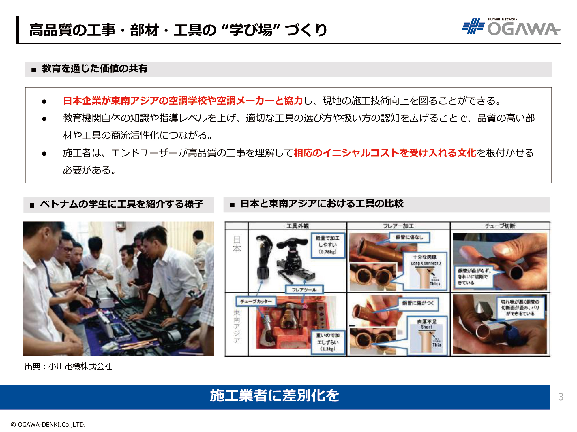 ③空調工事を勉強する人は、真剣に技術を学び、高品質の工具や部材をつかう。