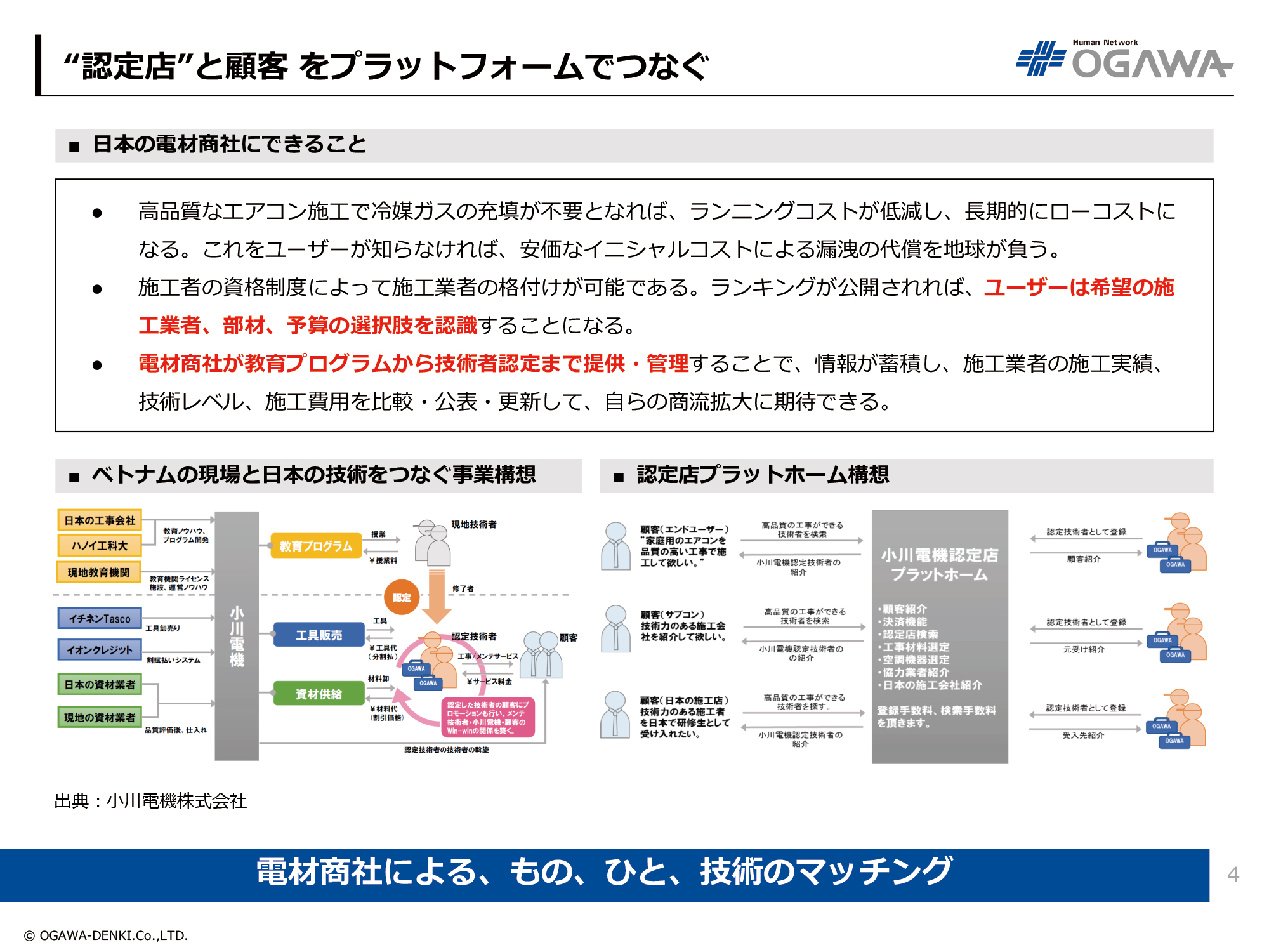 - 電材商社が教育プログラムから技術者認定まで提供・管理することで、情報が蓄積し、施工業者の施工実績、技術レベル、施工費用を比較・公表・更新して、自らの商流拡大に期待できる。
