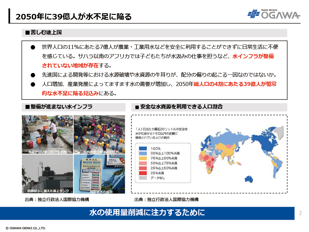 - 人口増加、産業発展によってますます水の需要が増加し、2050年総人口の4割にあたる39億人が恒常的な水不足に陥る見込みにある。