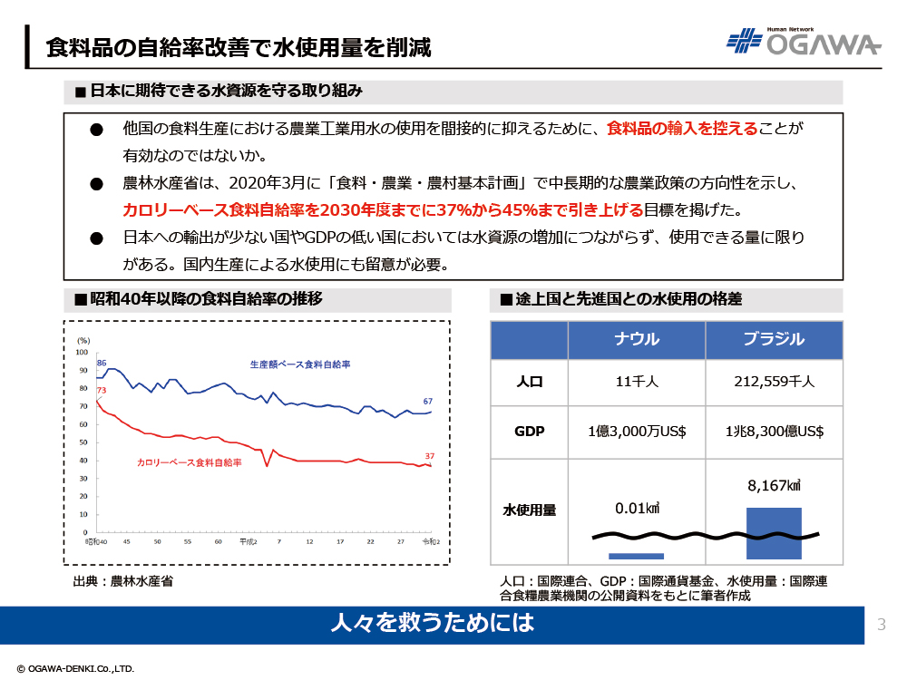 - 先進国から途上国含め水資源に恵まれない地域へ、海水の淡水化技術や排水・下水の再利用技術などを積極的に提供・指導し、自国で水資源を循環させることが必要だ。