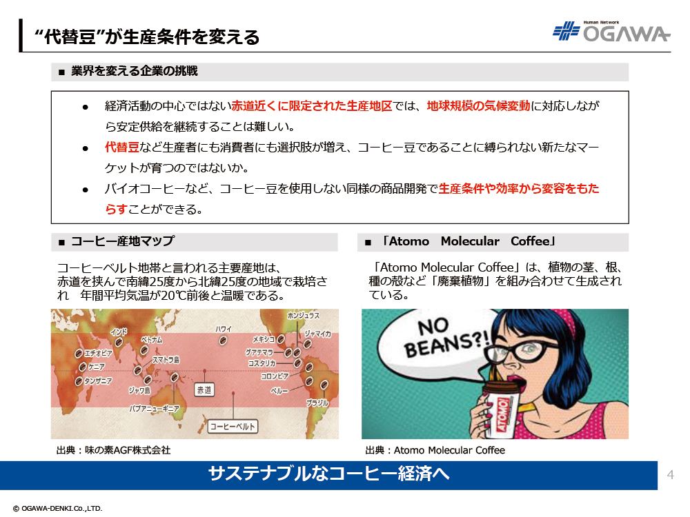 - バイオコーヒーなど、コーヒー豆を使用しない同様の商品開発で生産条件や効率から変容をもたらすことができる。