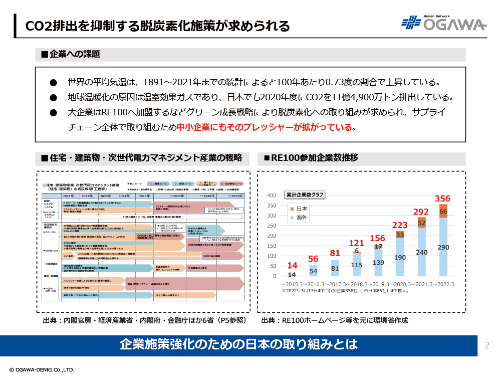 - 大企業はRE100へ加盟するなどグリーン成長戦略により脱炭素化への取り組みが求められ、サプライチェーン全体で取り組むため中小企業にもそのプレッシャーが拡がっている。