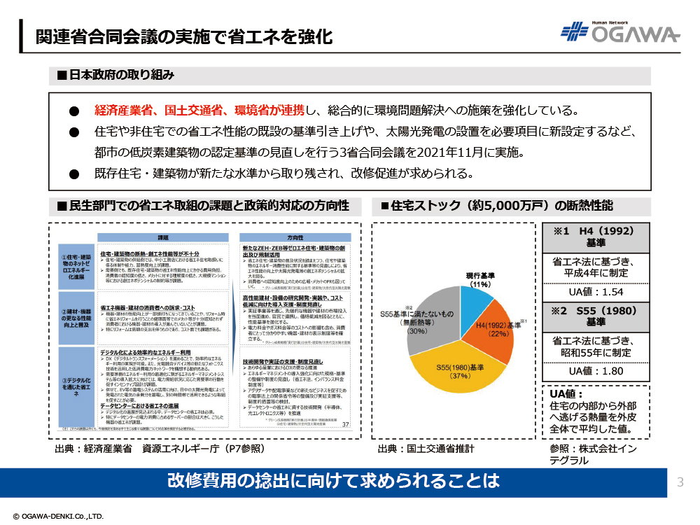 - 住宅や非住宅での省エネ性能の既設の基準引き上げや、太陽光発電の設置を必要項目に新設定するなど、都市の低炭素建築物の認定基準の見直しを行う3省合同会議を2021年11月に実施。