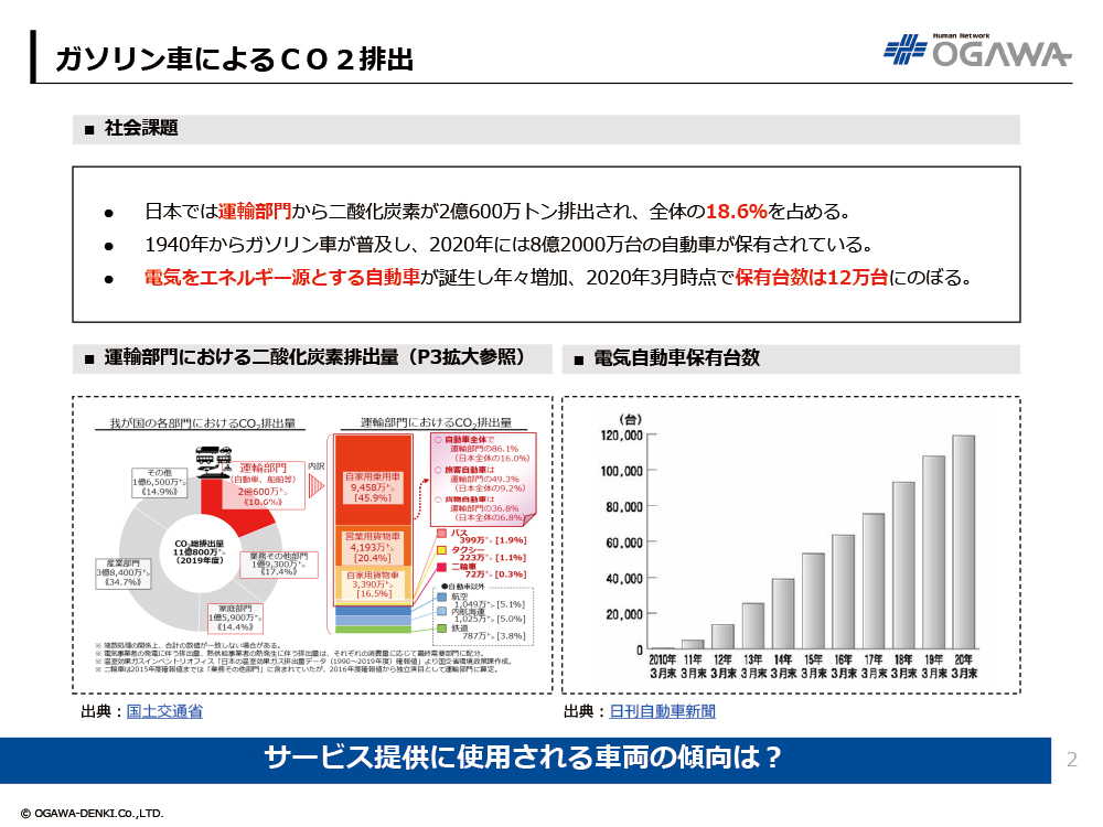 - 電気をエネルギー源とする自動車が誕生し年々増加、2020年3月時点で保有台数は12万台にのぼる。