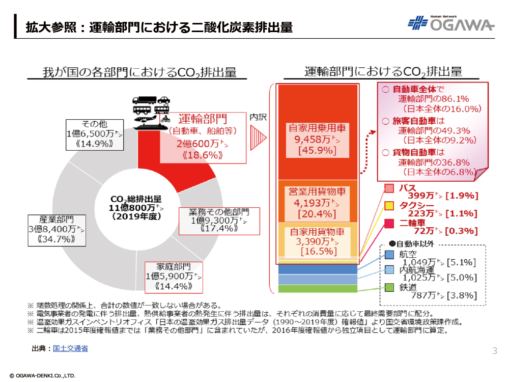 - 日本では運輸部門から二酸化炭素が2億600万トン排出され、全体の18.6%を占める。