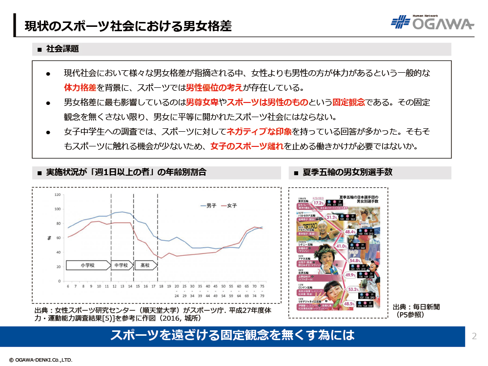 - 現代社会において様々な男女格差が指摘される中、女性よりも男性の方が体力があるという一般的な体力格差を背景に、スポーツでは男性優位の考えが存在している。