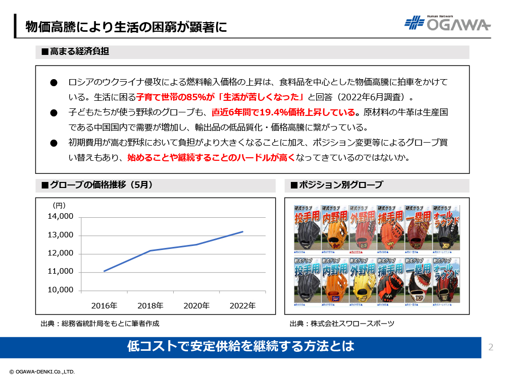- 子どもたちが使う野球のグローブも、直近6年間で19.4%価格上昇している。原材料の牛革は生産国である中国国内で需要が増加し、輸出品の低品質化・価格高騰に繋がっている。