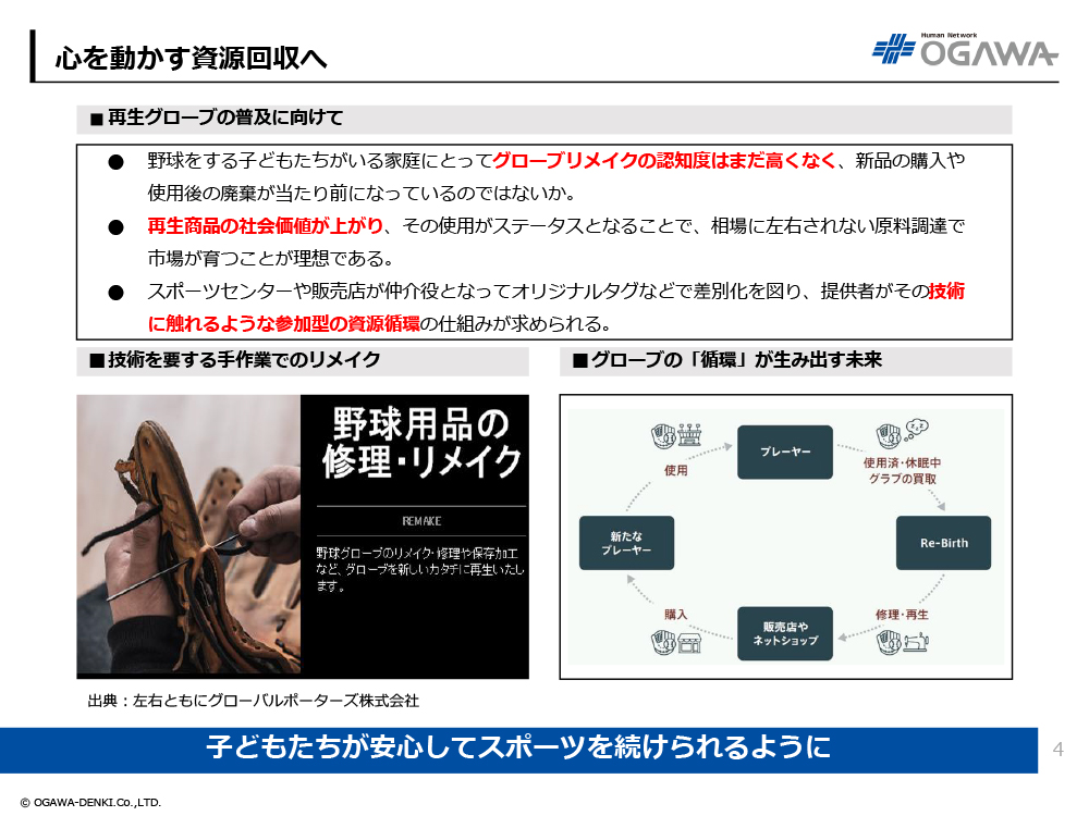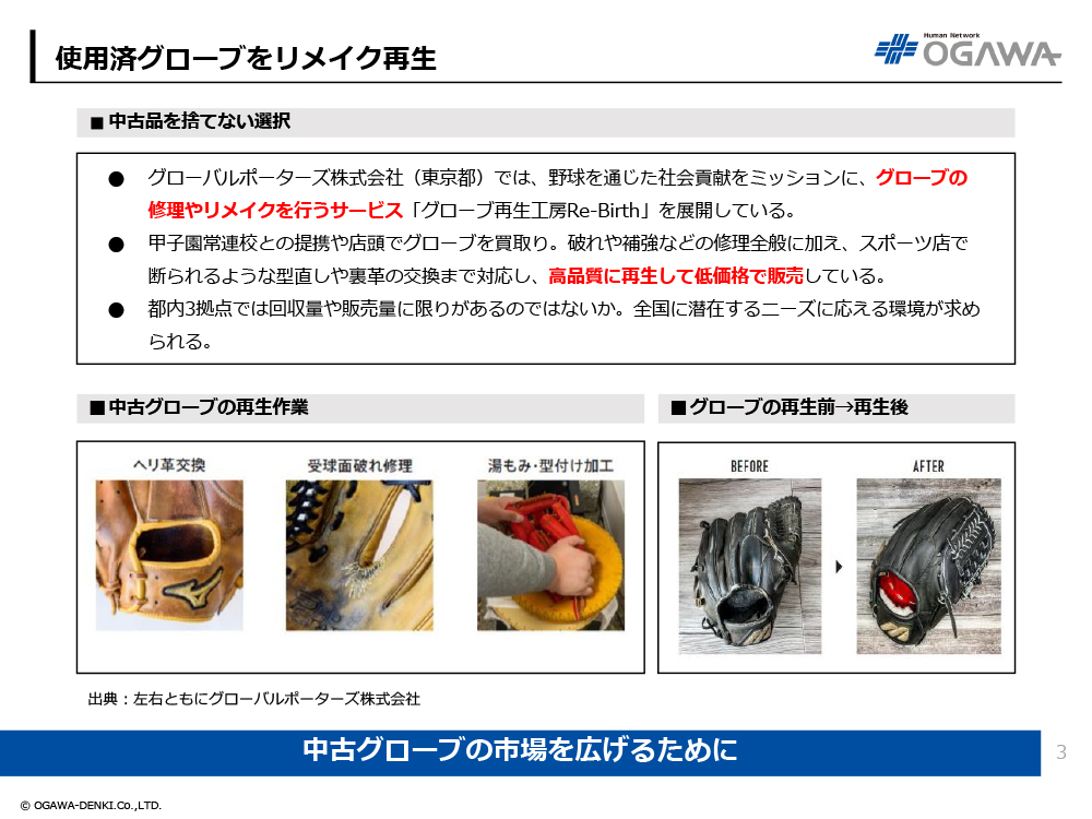 - グローバルポーターズ株式会社(東京都)では、野球を通じた社会貢献をミッションに、グローブの修理やリメイクを行うサービス「グローブ再生工房Re-Birth」を展開している。