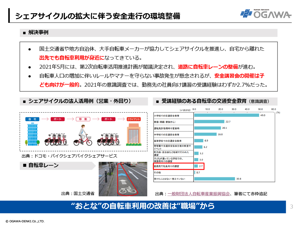 - 自転車人口の増加に伴いルールやマナーを守らない事故発生が懸念されるが、安全講習会の開催は子ども向けが一般的。2021年の意識調査では、勤務先の社員向け講習の受講経験はわずか2.7%だった。