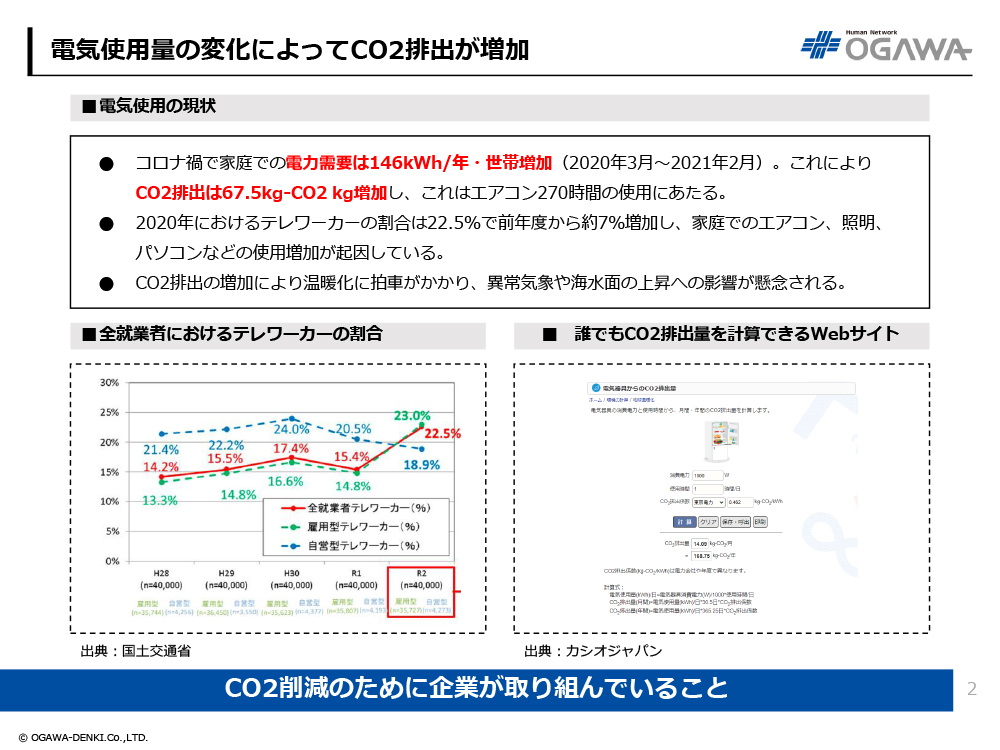 - 2020年におけるテレワーカーの割合は22.5%で前年度から約7%増加し、家庭でのエアコン、照明、パソコンなどの使用増加が起因している。