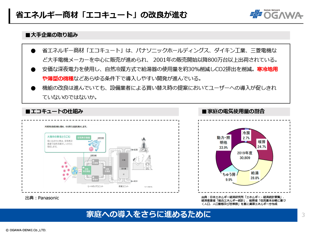 - 省エネルギー商材「エコキュート」は、パナソニックホールディングス、ダイキン工業、三菱電機など大手電機メーカーを中心に販売が進められ、 2001年の販売開始以降800万台以上出荷されている。