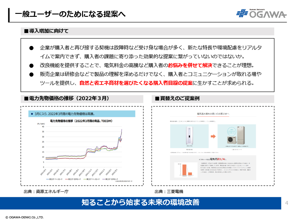- 改良機能を提供することで、電気料金の高騰など購入者のお悩みを併せて解決できることが理想。