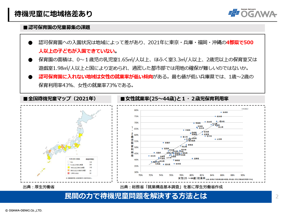 - 認可保育園への入園状況は地域によって差があり、2021年に東京・兵庫・福岡・沖縄の4都県で500人以上の子どもが入園できていない。