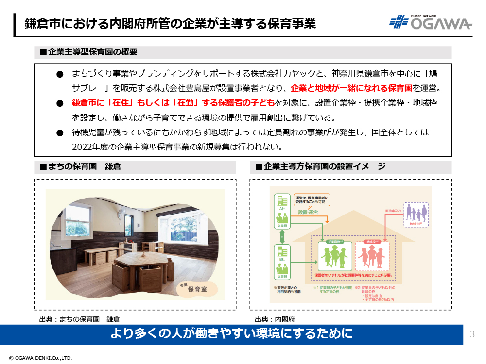 - まちづくり事業やブランディングをサポートする株式会社カヤックと、神奈川県鎌倉市を中心に「鳩サブレ―」を販売する株式会社豊島屋が設置事業者となり、企業と地域が一緒になれる保育園を運営。