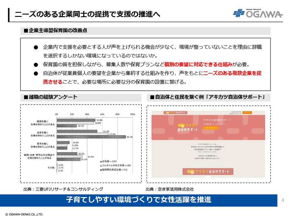 - 自治体が従業員個人の要望を企業から集約する仕組みを作り、声をもとにニーズのある複数企業を提携させることで、必要な場所に必要な分の保育園の設置に繋げる。