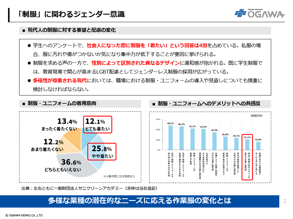 - 制服を求める声の一方で、性別によって区別された異なるデザインに違和感が抱かれる。既に学生制服では、教育現場で関心が高まるLGBT配慮としてジェンダーレス制服の採用が広がっている。