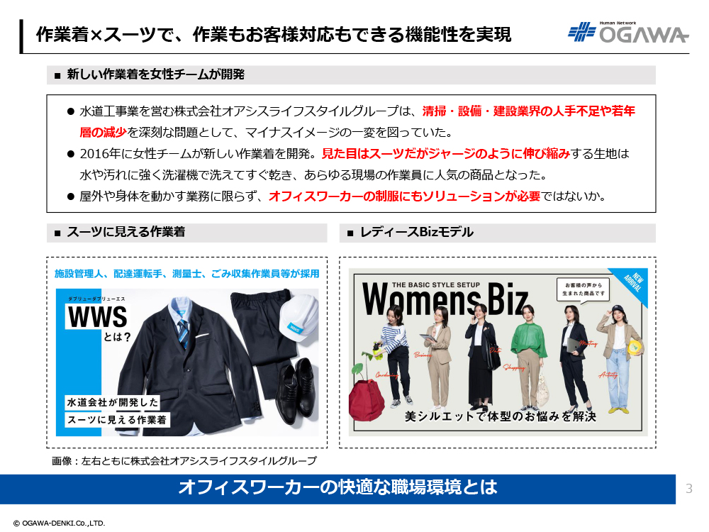 - 2016年に女性チームが新しい作業着を開発。見た目はスーツだがジャージのように伸び縮みする生地は水や汚れに強く洗濯機で洗えてすぐ乾き、あらゆる現場の作業員に人気の商品となった。