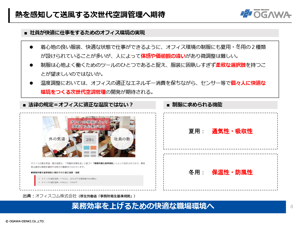 - 着心地の良い服装、快適な状態で仕事ができるように、オフィス環境の制服にも夏用・冬用の2種類が設けられていることが多いが、人によって体感や価値観の違いがあり微調整は難しい。