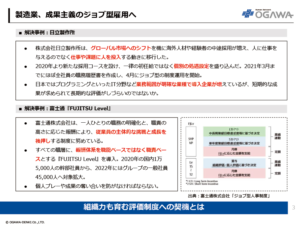 - 株式会社日立製作所は、グローバル市場へのシフトを機に海外人材や経験者の中途採用が増え、人に仕事を与えるのでなく仕事や課題に人を投入する動きに移行した。