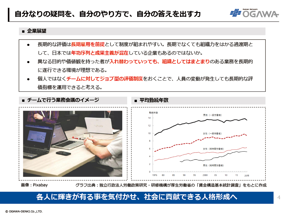 - 長期的な評価は長期雇用を前提として制度が組まれやすい。長期でなくても組織力をはかる過渡期として、日本では年功序列と成果主義が混在している企業もあるのではないか。
