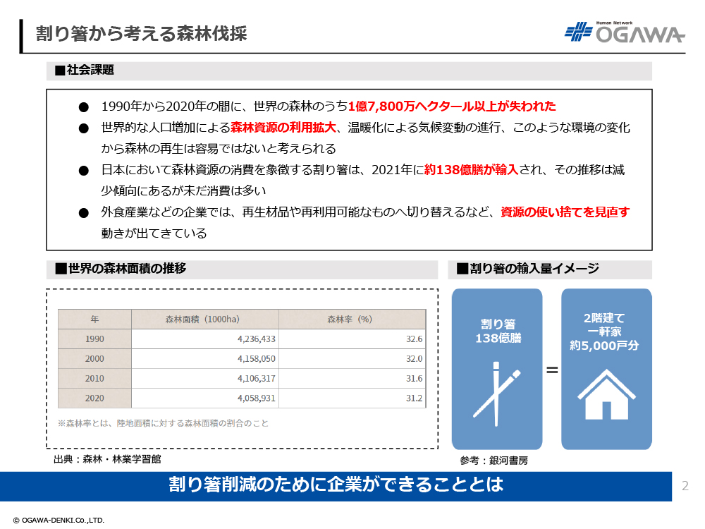 - 日本において森林資源の消費を象徴する割り箸は、2021年に約138億膳が輸入され、その推移は減少傾向にあるが未だ消費は多い