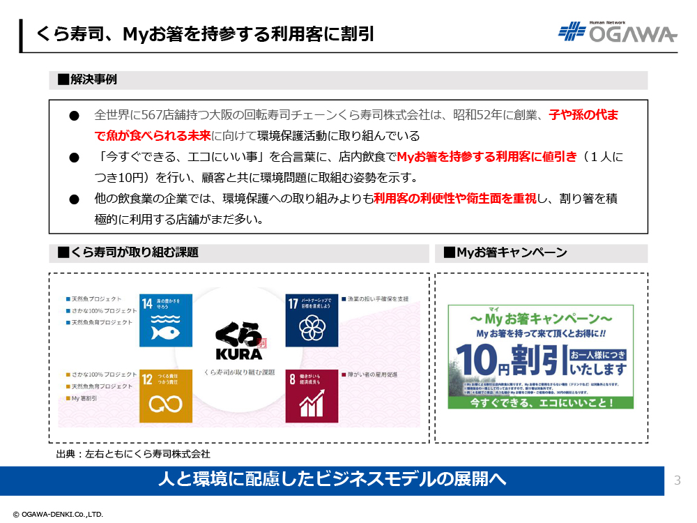 - 全世界に567店舗持つ大阪の回転寿司チェーンくら寿司株式会社は、昭和52年に創業、子や孫の代まで魚が食べられる未来に向けて環境保護活動に取り組んでいる