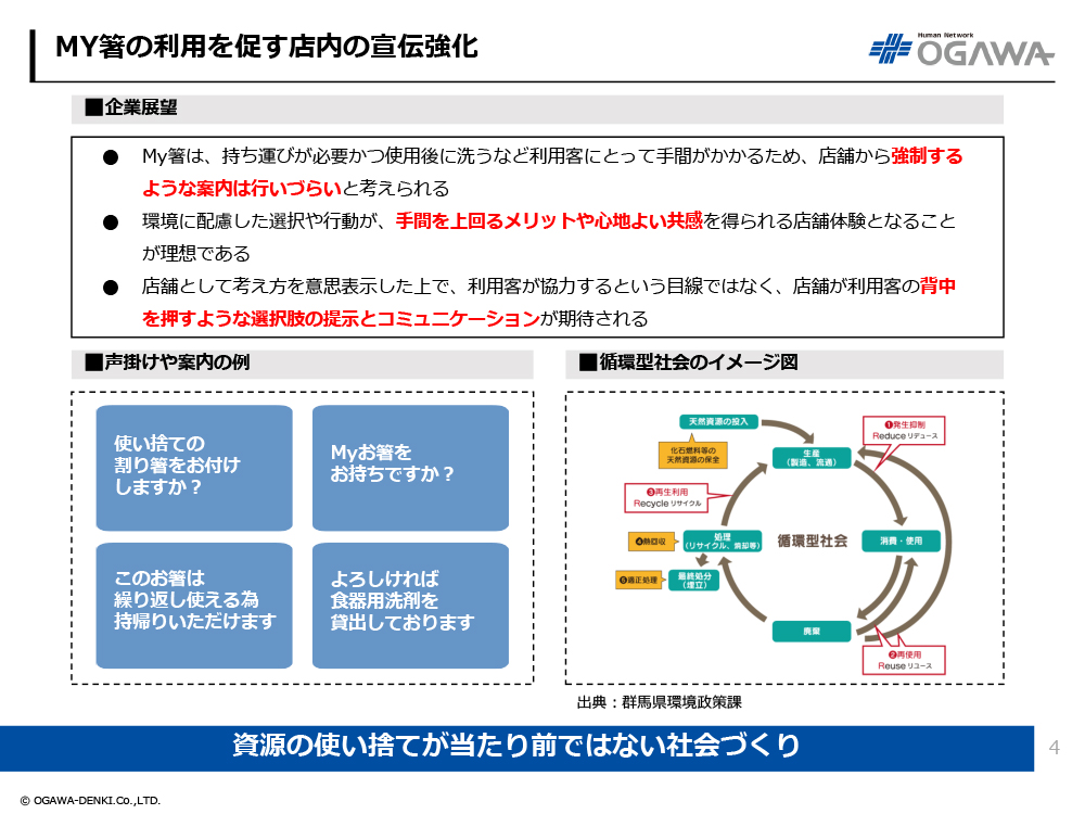 - 他の飲食業の企業では、環境保護への取り組みよりも利用客の利便性や衛生面を重視し、割り箸を積極的に利用する店舗がまだ多い。