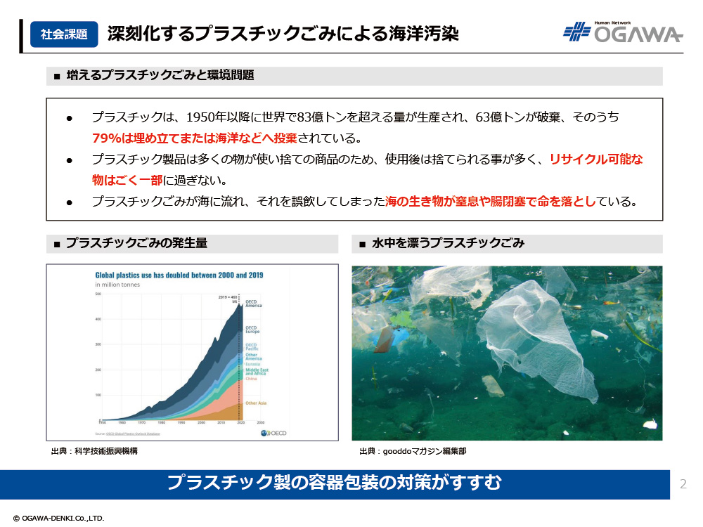 - プラスチックは、1950年以降に世界で83億トンを超える量が生産され、63億トンが破棄、そのうち79%は埋め立てまたは海洋などへ投棄されている。