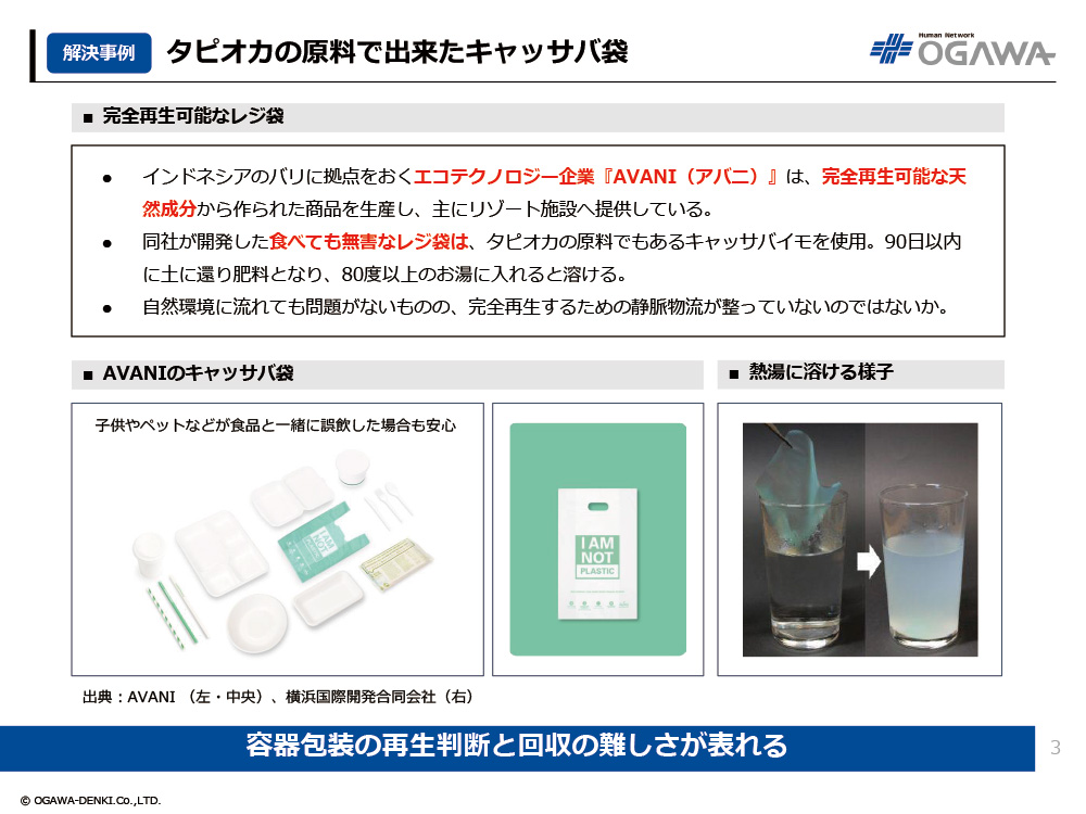 - 同社が開発した食べても無害なレジ袋は、タピオカの原料でもあるキャッサバイモを使用。90日以内に土に還り肥料となり、80度以上のお湯に入れると溶ける。