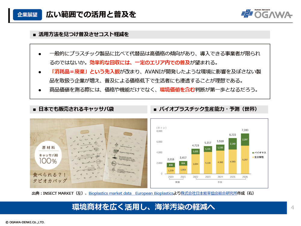 - 「消耗品=廃棄」という先入観が改まり、AVANIが開発したような環境に影響を及ぼさない製品を取扱う企業が増え、普及による価格低下で生活者にも浸透することが理想である。