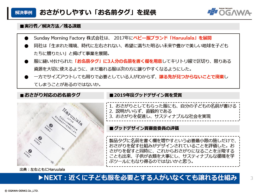 - 服に縫い付けられた「お名前タグ」に3人分の名前を書く欄を用意してキリトリ線で区切り、限りある資源を大切に使えるように、まだ着れる服は次の方に譲りやすくなるようにした。