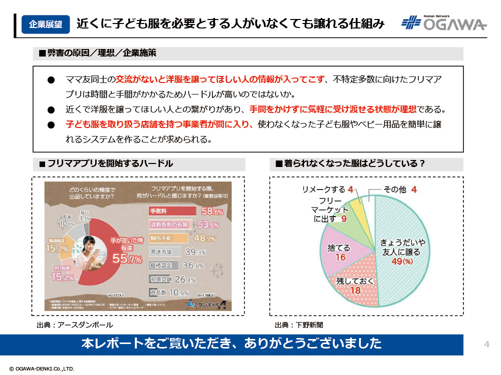 - ママ友同士の交流がないと洋服を譲ってほしい人の情報が入ってこず、不特定多数に向けたフリマアプリは時間と手間がかかるためハードルが高いのではないか。