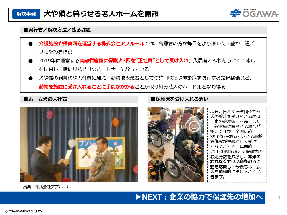 - 2019年に運営する高齢者施設に保護犬3匹を“正社員”として受け入れ、入居者とふれあうことで癒しを提供し、時にリハビリのパートナーになっている