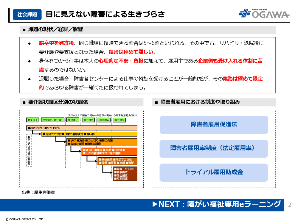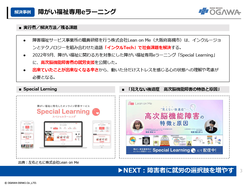 - 2022年9月、障がい福祉に関わる方を対象にした障がい福祉専用eラーニング「Special Learning」に、高次脳機能障害者の就労支援を公開した。