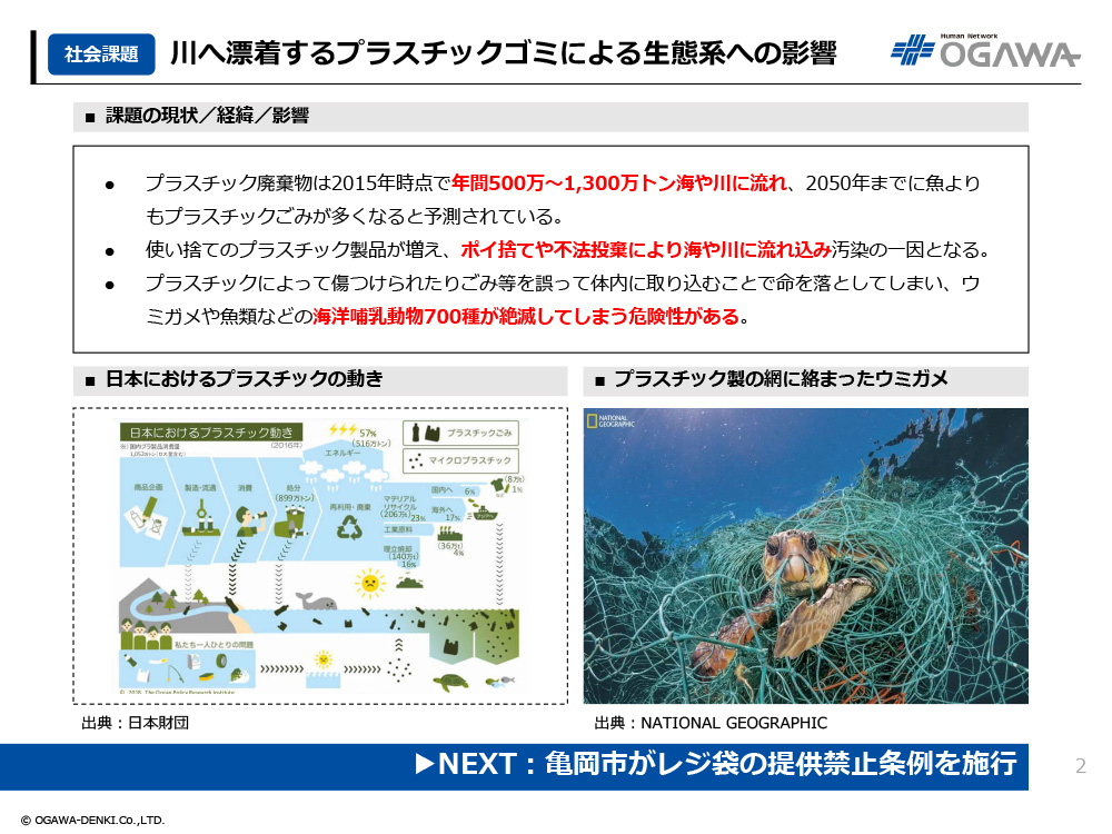 - プラスチック廃棄物は2015年時点で年間500万~1,300万トン海や川に流れ、2050年までに魚よりもプラスチックごみが多くなると予測されている。