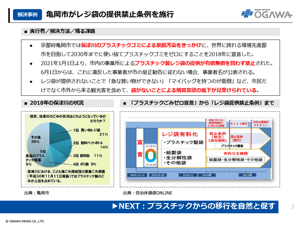 - 京都府亀岡市では保津川のプラスチックゴミによる景観汚染をきっかけに、世界に誇れる環境先進都市を目指して2030年までに使い捨てプラスチックゴミをゼロにすることを2018年に宣言した。