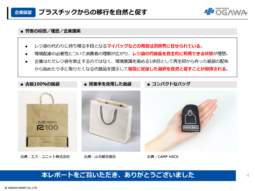 - 企業はただレジ袋を禁止するのではなく、環境意識を高める1歩目として再生材から作った紙袋の配布から始めたり手に取りたくなる代替品を提示して環境に配慮した選択を自然と促すことが期待される。