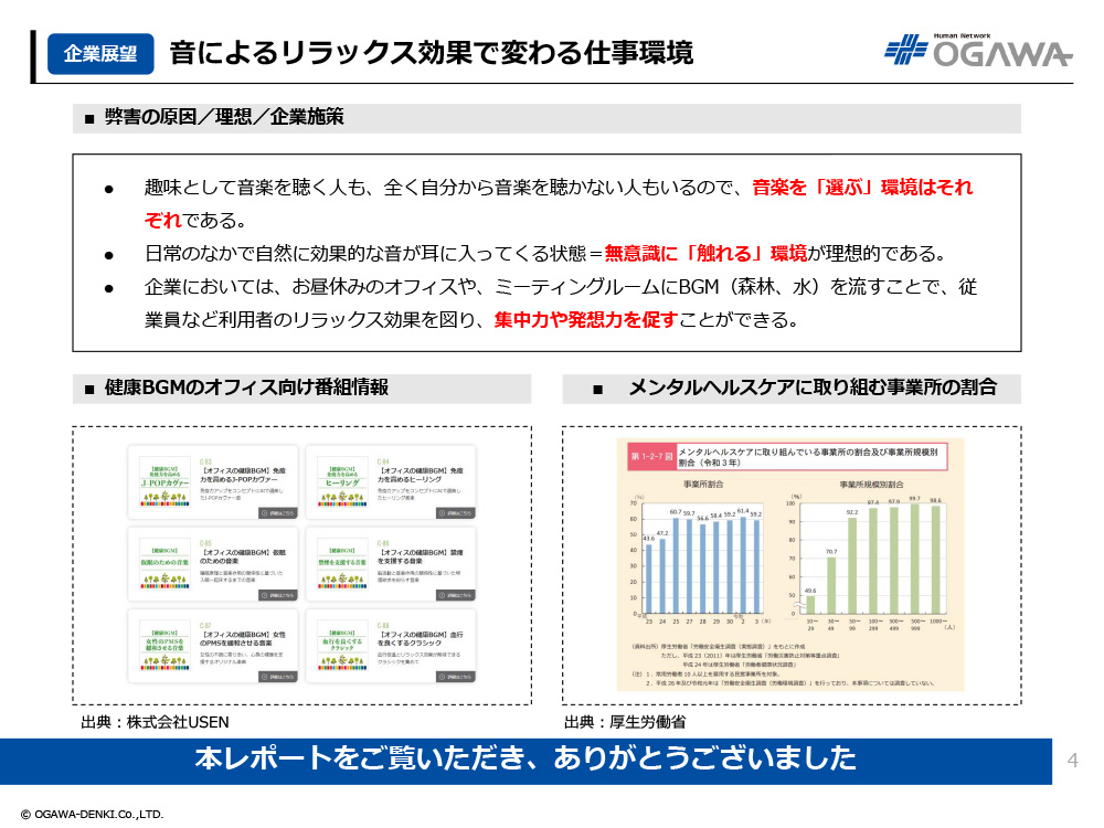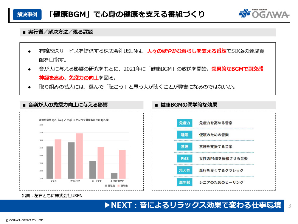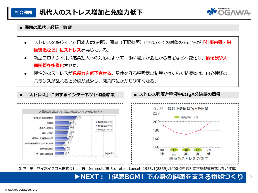 - 音が人に与える影響の研究をもとに、2021年に「健康BGM」の放送を開始。効果的なBGMで副交感神経を高め、免疫力の向上を図る。
