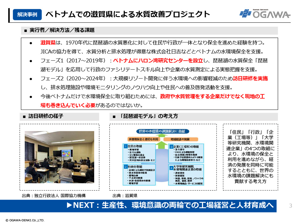 - 滋賀県は、1970年代に琵琶湖の水質悪化に対して住民や行政が一体となり保全を進めた経験を持つ。JICAの協力を得て、水質分析と排水処理が得意な株式会社日吉などとベトナムの水環境保全を支援。