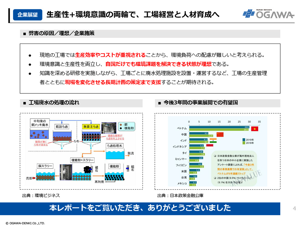 - 知識を深める研修を実施しながら、工場ごとに廃水処理施設を設置・運営するなど、工場の生産管理者とともに現場を変化させる長期計画の策定まで支援することが期待される。