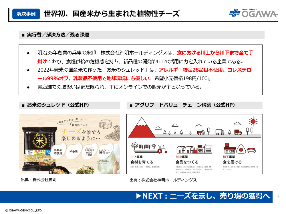 - 明治35年創業の兵庫の米卸、株式会社神明ホールディングスは、食における川上から川下まで全て手掛けており、食糧供給の危機感を持ち、新品種の開発やIoTの活用に力を入れている企業である。