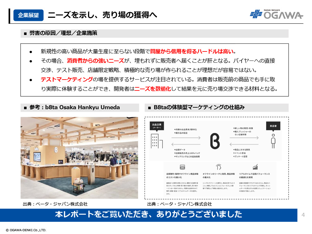 - テストマーケティングの場を提供するサービスが注目されている。消費者は販売前の商品でも手に取り実際に体験することができ、開発者はニーズを数値化して結果を元に売り場交渉できる材料となる。