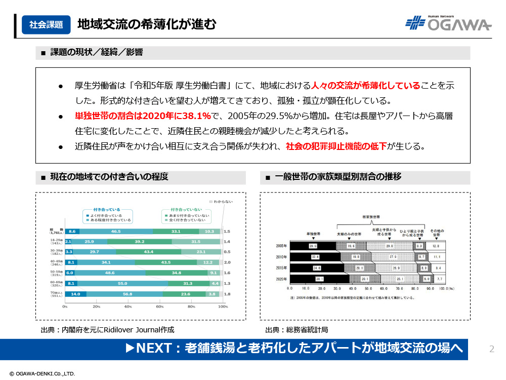 - 単独世帯の割合は2020年に38.1%で、2005年の29.5%から増加。住宅は長屋やアパートから高層住宅に変化したことで、近隣住民との親睦機会が減少したと考えられる。