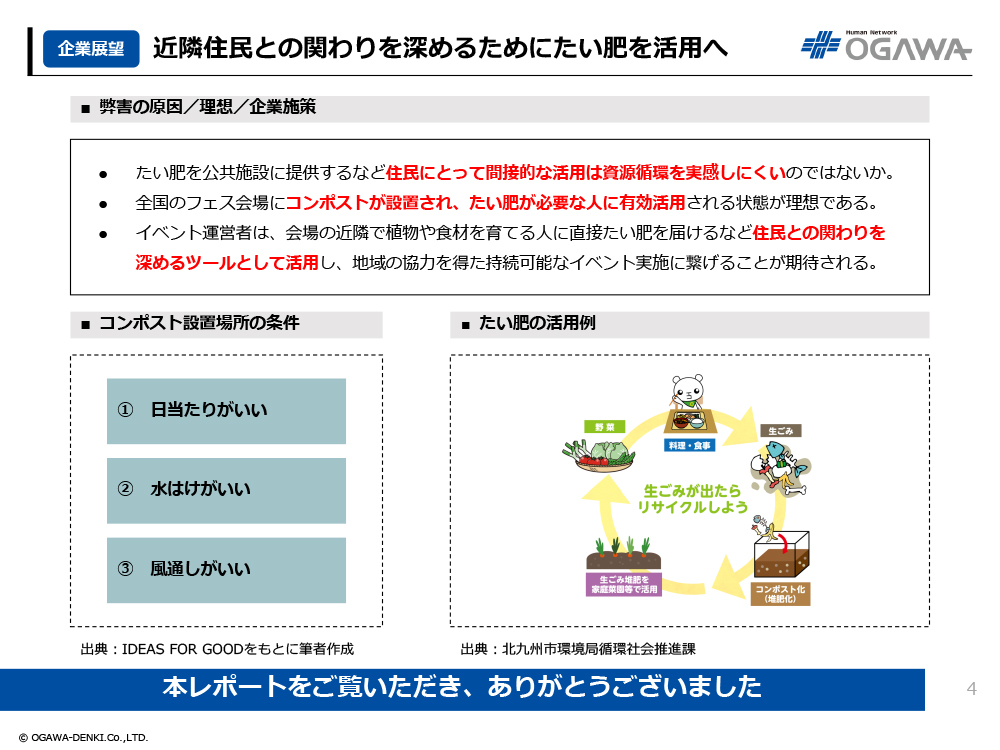 - たい肥の活用方法の工夫により、近隣住民一人一人との関係を強化できる余地があるのではないか。
