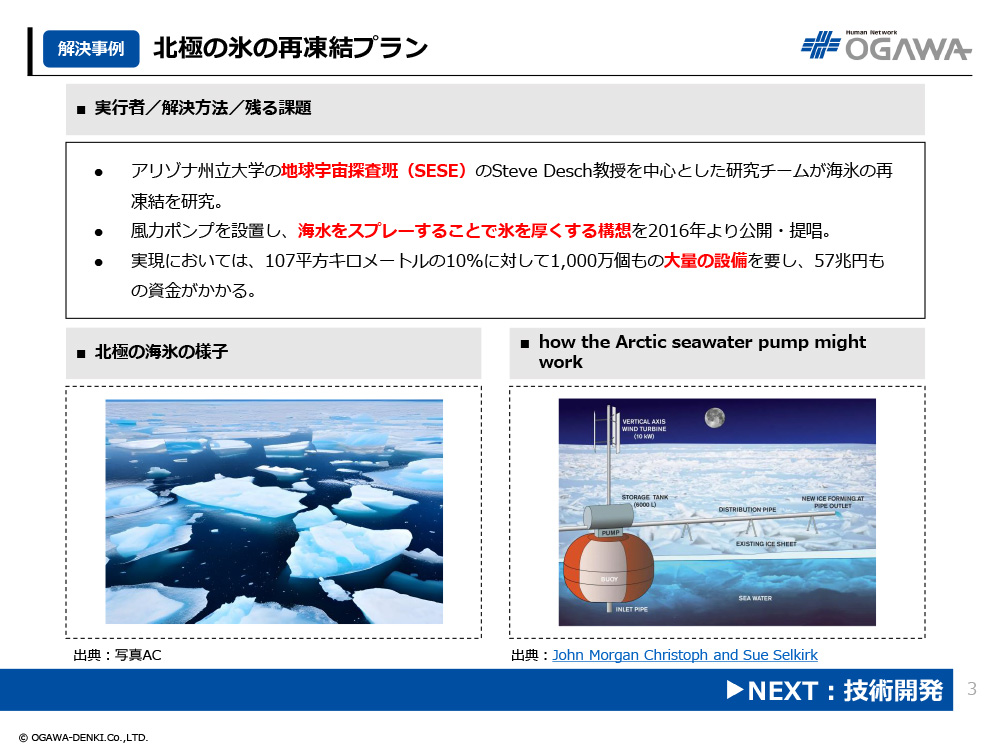 - 風力ポンプを設置し、海水をスプレーすることで氷を厚くする構想を2016年より公開・提唱。