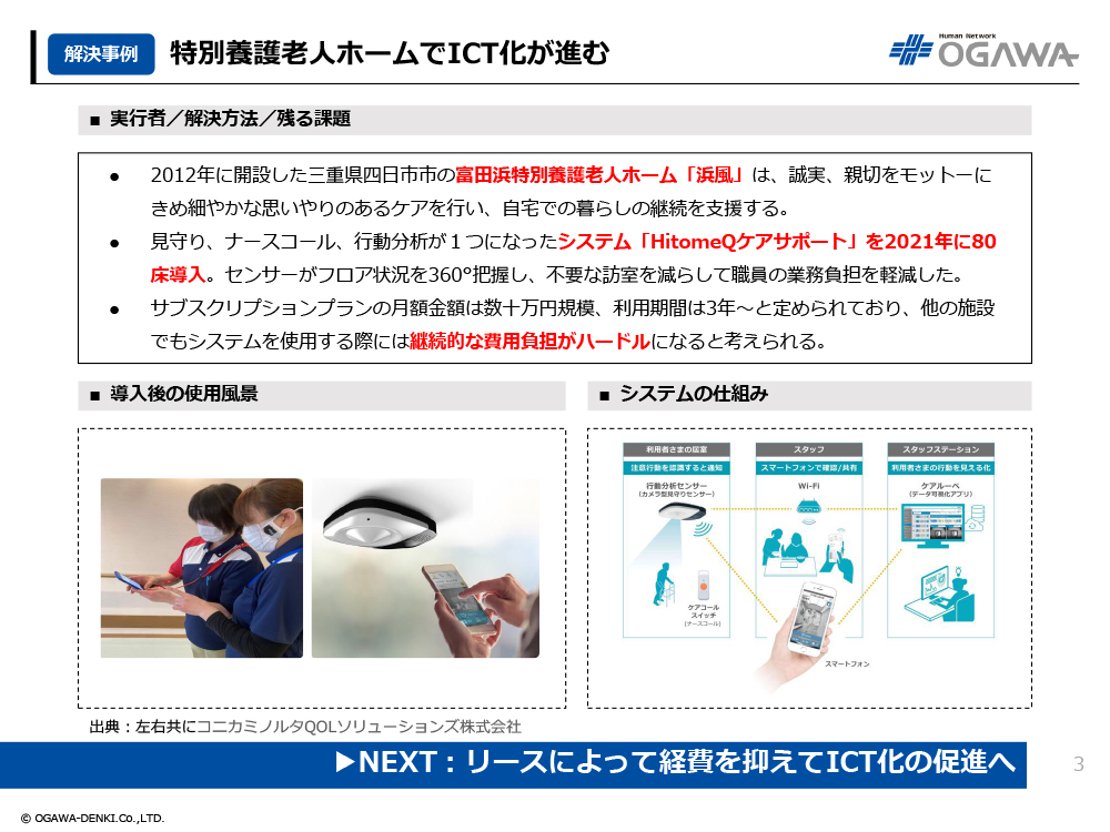 - ICT機器の販売会社は短期間のお試しパックを提供して効果を実感してもらうことで、介護施設が導入に踏み切りやすくなることが期待される。
