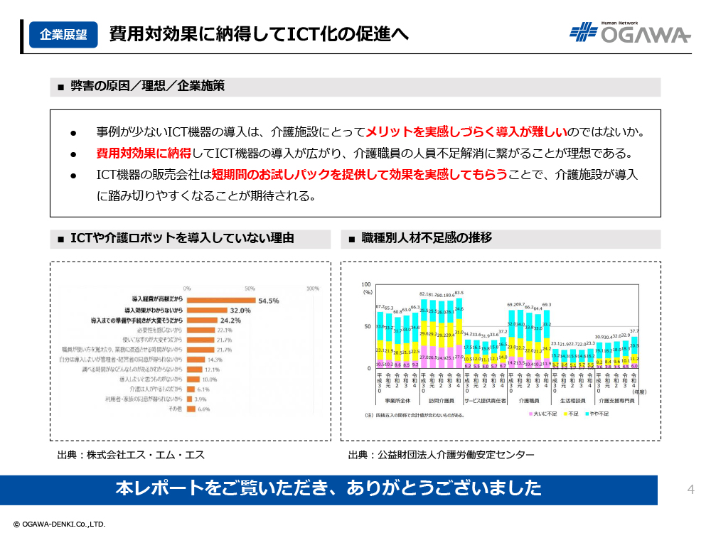 - 費用対効果に納得してICT機器の導入が広がり、介護職員の人員不足解消に繋がることが理想である。