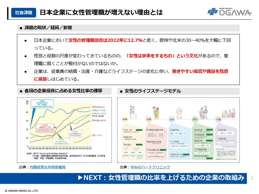 - 日本企業において女性の管理職割合は2022年に12.7%と低く、欧州や北米の30~40%を大幅に下回っている。